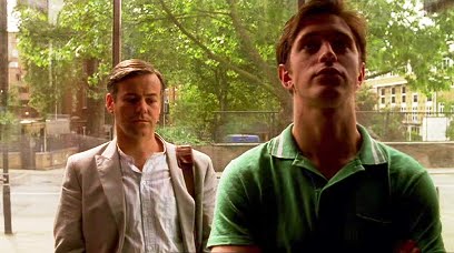Back in the public toilets, Julian is still there, spying through a glory hole in one of the cubicles. He attracts a guy in the neighbouring cubicle, whom he proceeds to suck off. The other guy abruptly enters Julian’s cubicle and roughly fucks him. Alfie enters the toilets and hears the sound of the two men having sex as he tries to urinate. The guy leaves and Alfie briefly sees Julian with his trousers down inside the cubicle, before he shuts the door. Alfie is then approached by two guys, who chase him out of the toilets and onto Clapham Common. Julian arrives at the dinner party, where Robin recognises him as the guy he saw in the toilets.