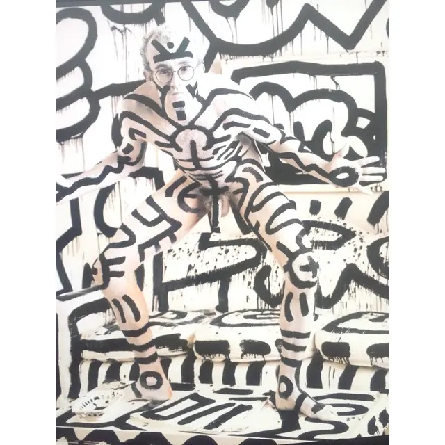 Haring began collaborating with Grace Jones, whom he had met through Andy Warhol, for an interview magazine shoot in 1984. Haring painted Jones’ body for her music video “I’m Not Perfect” (1986) and live performances at the Paradise Garage. He also painted Jones’ for her role of Katrina the Queen of The Vampires in the 1986 film Vamp. Haring collaborated with David Spada, a jewellery designer, to design the sculptural adornments for Jones.