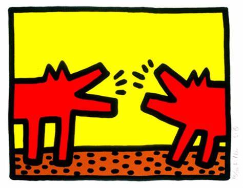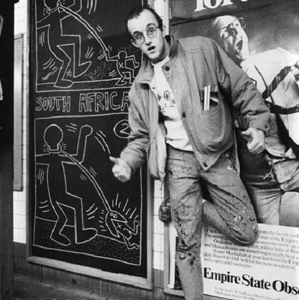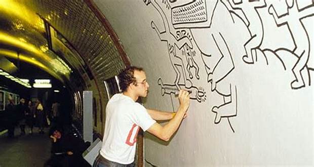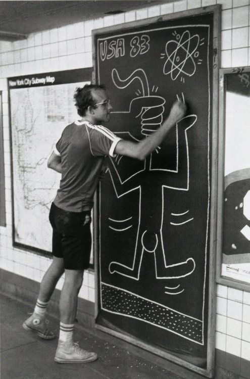 Haring first received public attention with his graffiti art in subways, where he created white chalk drawings on black, unused advertisement backboards in the stations. He considered the subways to be his “laboratory”, a place where he could experiment and create his artwork and saw the black advertisement paper as a free space and “the perfect place to draw”. The Radiant Baby, a crawling infant with emitting rays of light, became his most recognized symbol. He used it as his tag to sign his work while a subway artist. Symbols and images (such as barking dogs, flying saucers, and large hearts) became common in his work and iconography. As a result, Haring’s works spread quickly, and he became exceedingly more recognizable.