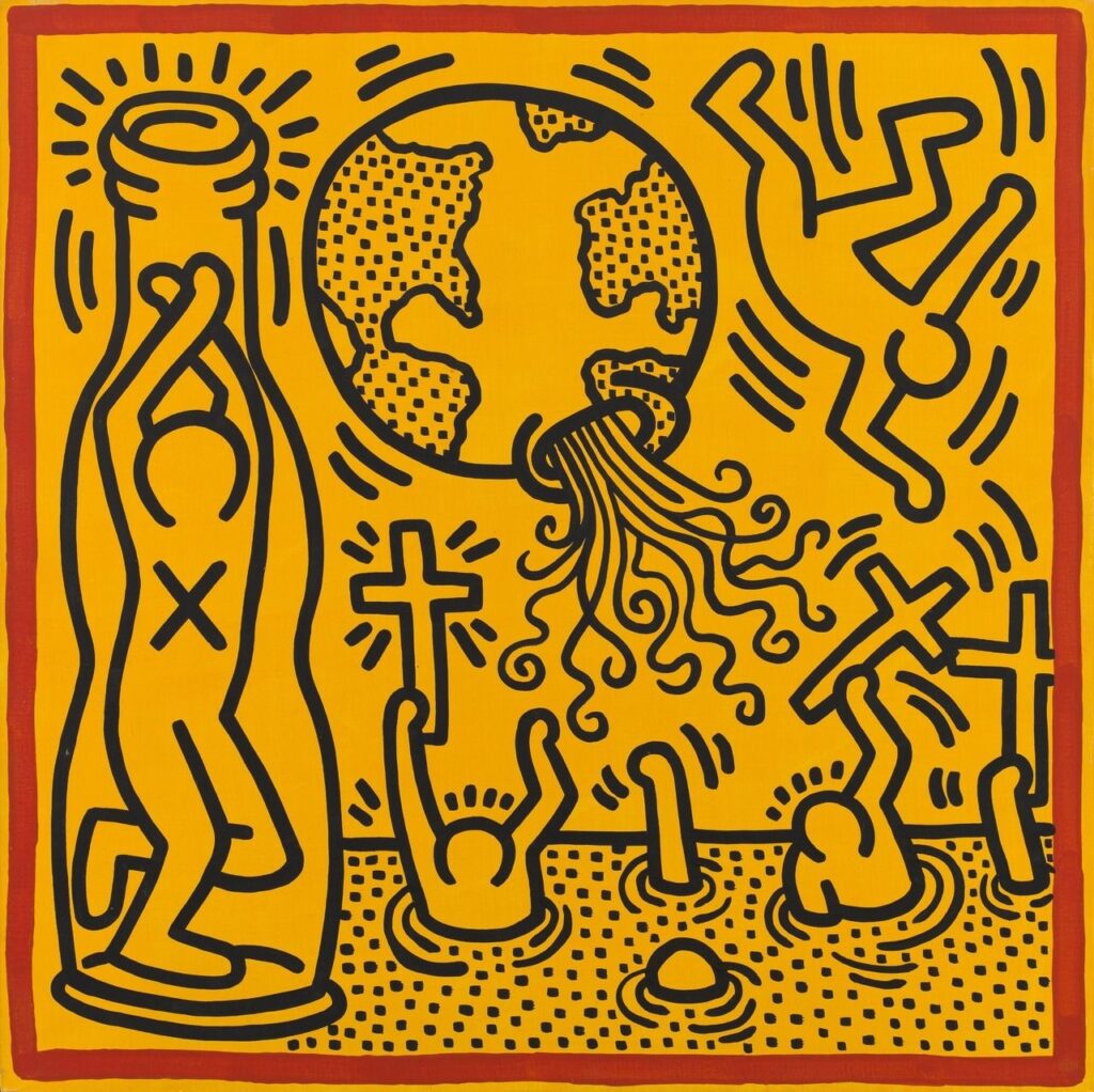 Haring was deeply influenced by the Jesus Movement as a youth, and it continued to play a role in his art for his entire career. The movement was an extremely evangelical, loosely organized, diverse group of Christians. They were known for their anti-materialism and anti-establishment beliefs, focus on the Last Judgment, and their compassionate treatment of the poor. As a young teenager, Haring became very involved in the movement. Religious symbols started to be incorporated into his drawings around that age as well as Jesus Movement sentiments. This includes anti-church establishment views that can be seen in some of his later work. Though his time as a “Jesus Person” did not last beyond his teenage years, religious images, symbols, and references continued to appear in his art. In an interview near the end of his life he commented, “[All] that stuff stuck in my head and even now there are lots of religious images in my work. Some people even think my work is by a religious fanatic or maniac.”