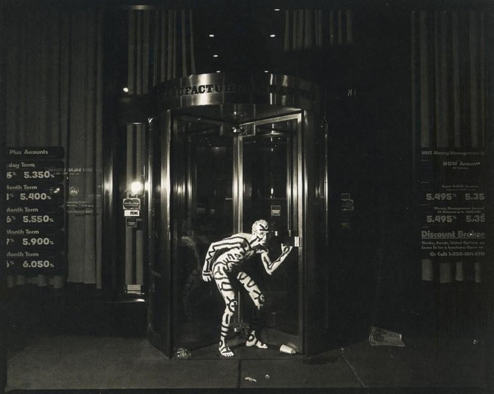 In February 1983, Haring had a solo exhibition at the Fun Gallery in the East Village, Manhattan. That year, Haring participated in the São Paulo Biennale in Brazil and the Whitney Biennial in New York. In April 1983, Haring was commissioned to paint a mural, Construction Fence, at the construction site of the Haggerty Museum of Art in Milwaukee. Later that year, Haring took part in the exhibition Urban Pulses: the Artist and the City in Pittsburgh by spray painting a room at the Pittsburgh Center for the Arts and creating an outdoor mural at PPG Place. In October 1983, Elio Fiorucci invited Haring to Milan to paint the walls of his Fiorucci store. While Haring was in London for the opening of his exhibition at the Robert Fraser Gallery in October 1983, he met and began collaborating with choreographer Bill T. Jones. Haring used Jones’ body as the canvas to paint from head to toe.