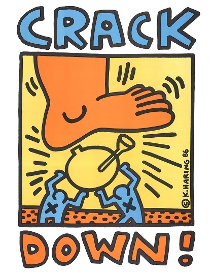 In June 1986, Haring created a 90-foot banner, CityKids Speak on Liberty, in conjunction with The CityKids Foundation to commemorate the centennial anniversary of the Statue of Liberty’s arrival in the United States. Later that month, he created his Crack is Wack mural in East Harlem, visible from New York’s FDR Drive. It was originally considered as vandalism by the New York Police Department and Haring was arrested. But after local media outlets picked up the story, Haring was released on a lesser charge. While in jail, Haring’s original work was vandalized. This mural is an example of Haring’s use of consciousness raising rather than consumerism, “Crack is Wack” rather than “Coke is it.” He painted an updated version of the mural on the same wall in October 1986.