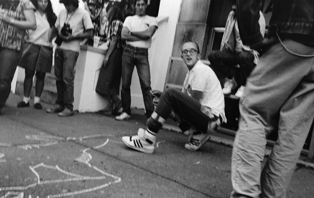 In 1979, Haring met photographer Tseng Kwong Chi in the East Village. They became friends and he documented much of Haring’s career. In 1980, Haring met and began collaborating with graffiti artist Angel “LA II” Ortiz. Haring recounted: “We just immediately hit it off. It’s as if we’d known each other all our lives. He’s like my little brother.” Ortiz’s artistry formed an important part of Haring’s work that has gone unacknowledged by the art establishment. Following Haring’s death, Ortiz stopped receiving credit and payment for his part in Haring’s work. According to Montez, author of the book Keith Haring’s Line: Race and the Performance of Desire, the Keith Haring Foundation and the art world have since made strides to rectify Ortiz’s erasure.