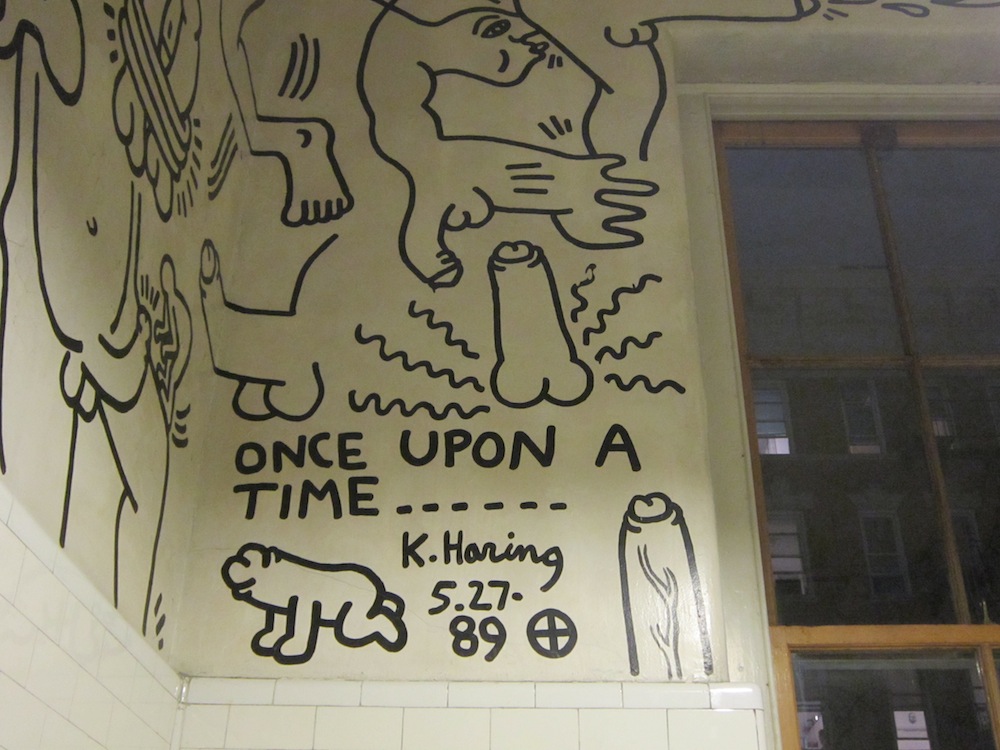 For The Center Show, an exhibition celebrating the 20th anniversary of the Stonewall Riots, Haring was invited by the Lesbian and Gay Community Services Center in New York to create a site-specific work. He chose the second-floor men’s bathroom to paint his Once Upon a Time… mural in May 1989. In June 1989, Haring painted his Tuttomondo mural on the rear wall of the convent of the Sant’Antonio Abate church in Pisa.