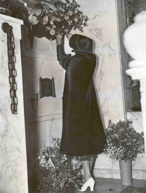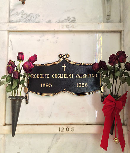 Over the years, a “woman in black” carrying a red rose has come to mourn at Valentino’s crypt, usually on the anniversary of his death. Several myths surround the woman, though it seems the first woman in black was actually a publicity stunt cooked up by press agent Russel Birdwell in 1928. A woman named Ditra Flame claimed to be the original “woman in black”. Several copycats have followed over the years. Although originally a PR stunt, it has become a tradition. The current “woman in black” is motion picture historian Karie Bible. This myth of “woman in black” was also a source of inspiration for the song “Long Black Veil“.