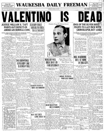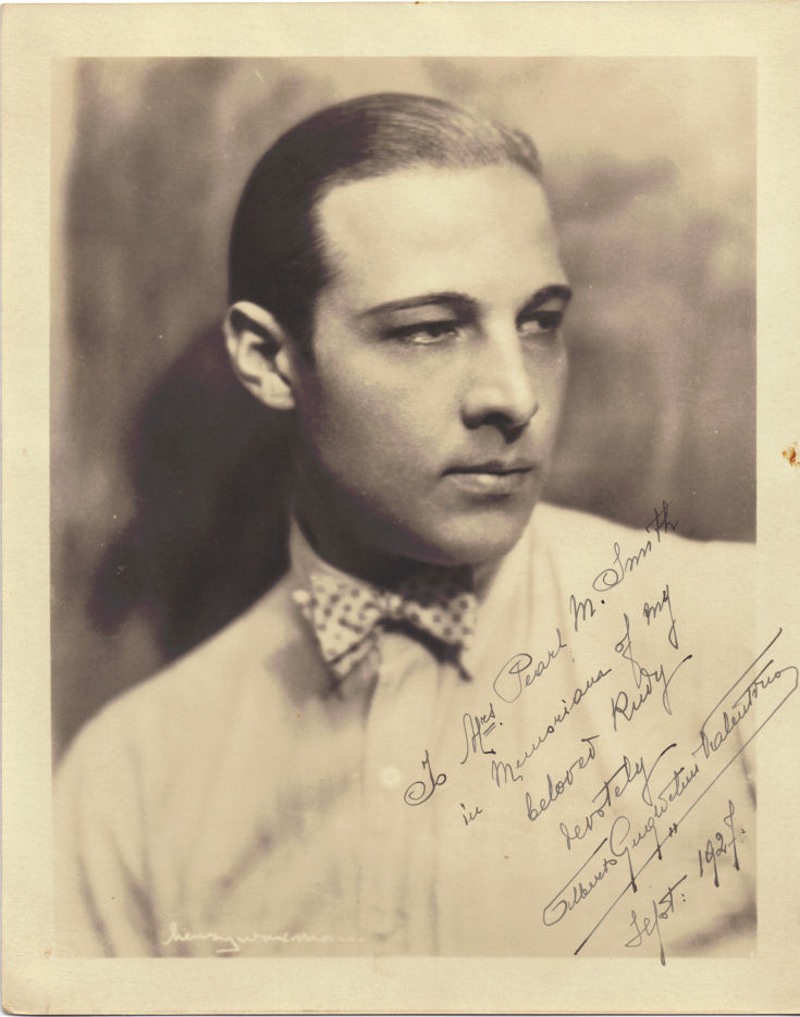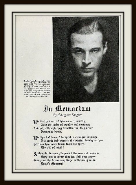 Valentino’s sex symbol status and his untimely death were a biographical part in John Dos Passos‘s The Big Money in the U.S.A. trilogy. His title was the Adagio Dancer.