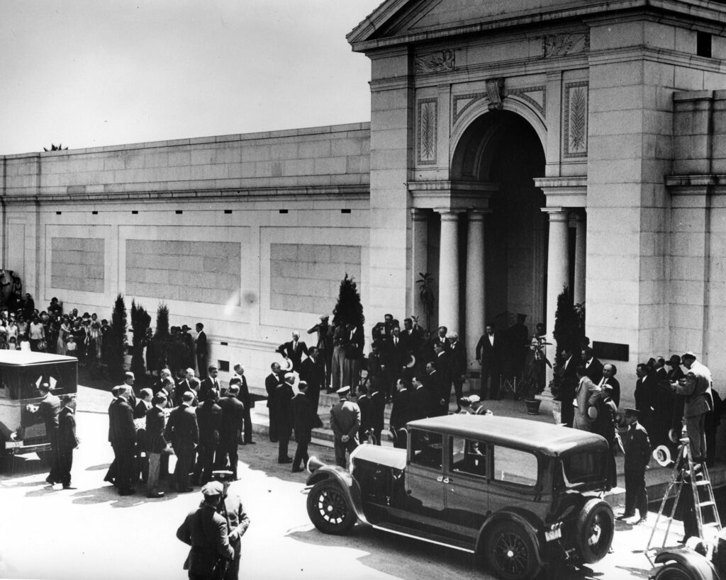 After Valentino’s remains were taken by train from New York to California, a second funeral was held on the West Coast, at the Catholic Church of the Good Shepherd in Beverly Hills. Valentino had no final burial arrangements, and his friend June Mathis arranged a temporary solution when she offered a crypt that she had purchased for the husband whom she had since divorced. Coincidentally, she died the following year and was interred in the adjoining crypt that she had purchased for herself; Valentino was never moved to a new location, and he remained in the crypt next to Mathis. The two are still interred side by side at Hollywood Forever Cemetery (originally Hollywood Memorial Park Cemetery) in Hollywood, California. Valentino left his estate to his brother, sister, and Rambova’s aunt Teresa Werner, who was left the share originally bequeathed to Rambova. His Beverly Hills mansion, Falcon Lair, was later owned by heiress Doris Duke. Duke died there in 1993. The home was later sold and underwent major renovations. The main building of the estate was razed in 2006, and the property was then put back on the market.