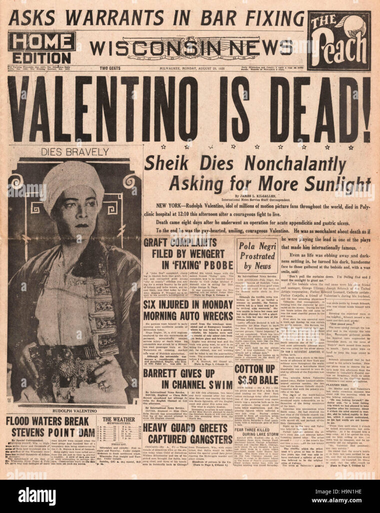On August 15, 1926, Valentino collapsed at the Hotel Ambassador on Park Avenue in Manhattan. He was hospitalized at the New York Polyclinic Hospital. Following an examination, he was diagnosed with appendicitis and gastric ulcers, and surgery was performed immediately. (His condition would eventually be referred to as “Valentino’s syndrome“—perforated ulcers mimicking appendicitis.) After surgery, Valentino developed peritonitis. On August 18, his doctors were optimistic about his prognosis. The media were told that unless Valentino’s condition deteriorated, no updates would be given. However, his condition worsened on August 21. He was stricken with a severe relapse of pleuritis, which developed rapidly in his left lung due to his weakened condition. The doctors realized that Valentino was going to die, but as was common at the time, chose to withhold this information. Valentino reportedly believed that he would recover. During the early hours of Monday, August 23, Valentino was briefly conscious and chatted with his doctors about his future, but soon lapsed into a coma. He died a few hours later at the age of 31. Following Valentino’s death, doctors who treated him later confirmed that the actor had contracted sepsis, an overwhelming infection.